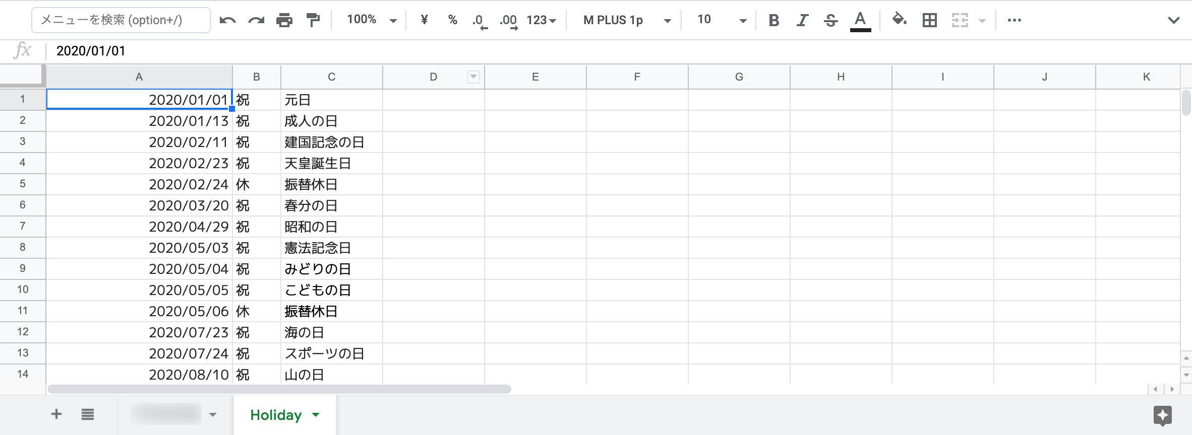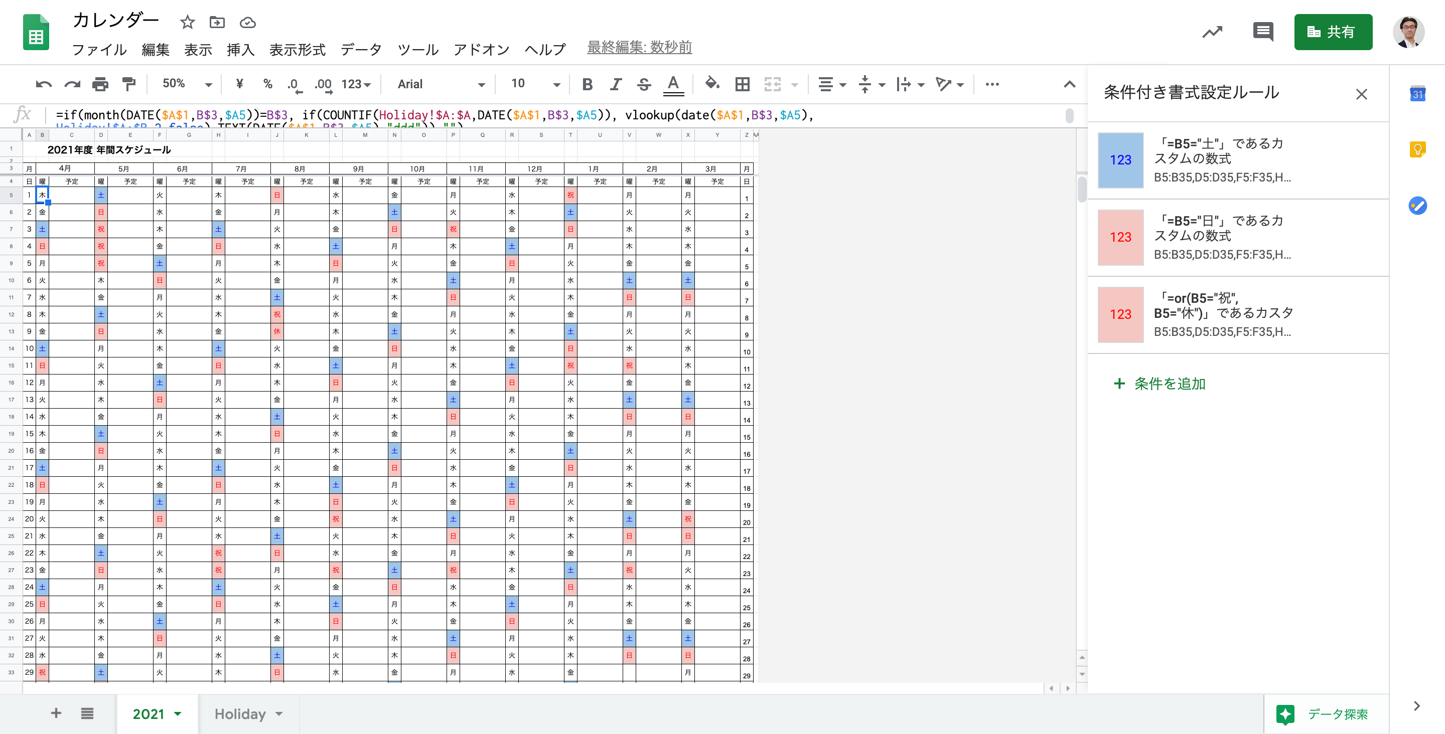 ということで、これ来年以降も使えるよう、年だけ変えれば、自動で変更して祝日もきちんと出るようにしてみました。